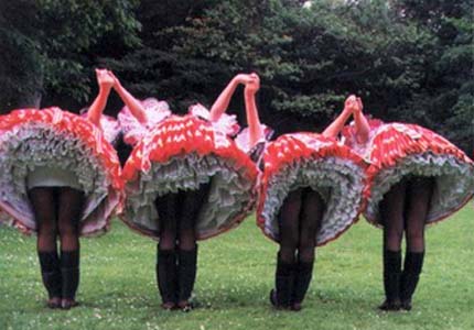 folk costumes. Interesting to note that each display a 'straight' under-petti for modesty. Reminds us of Lawrence Welk's policy of requiring such of dancers on his show. From Crinolyn |