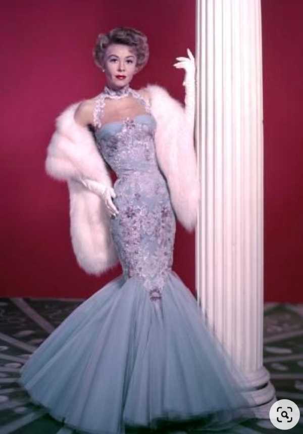 "Hollywood photography, the shadows on the wall, and the light behind her gown highlights her legs. the skirt has stones or sequins, the bodice is corset type with black lace - huge skirt, and no movie...that was listed."